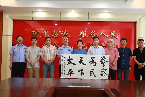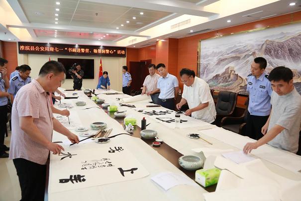 在淮滨县公安局,书画名家兴致勃勃地参观了该局办案中心、指挥中心,观看了巡特警处警科目演练。大家亲身感受淮滨县公安局取得的可喜成绩和民警奋发向上的精神风貌。